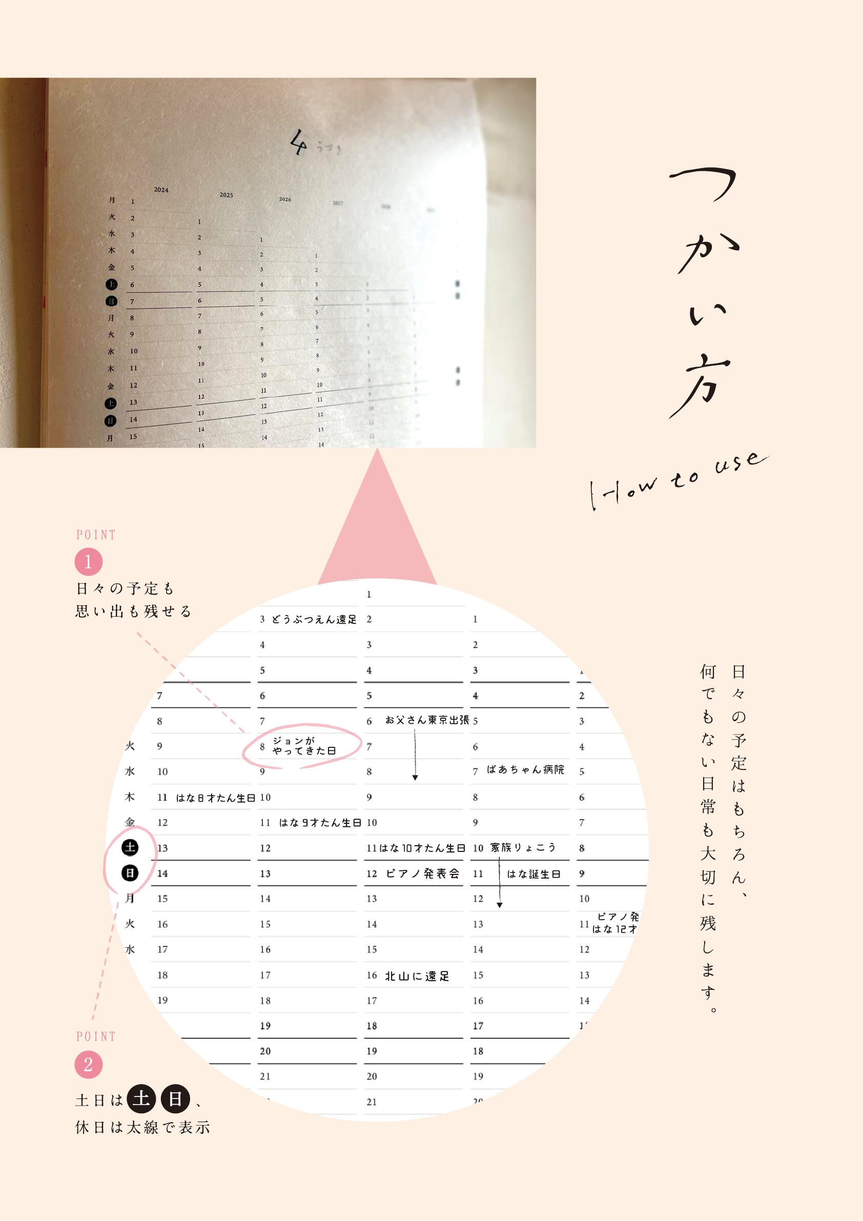 こちらは4月はじまりのカレンダーです。それぞれの月のページでは6年分の記録を書き込むことができ、6年の歳月をかけて一つのカレンダーに成長の記録を記していくことができます。